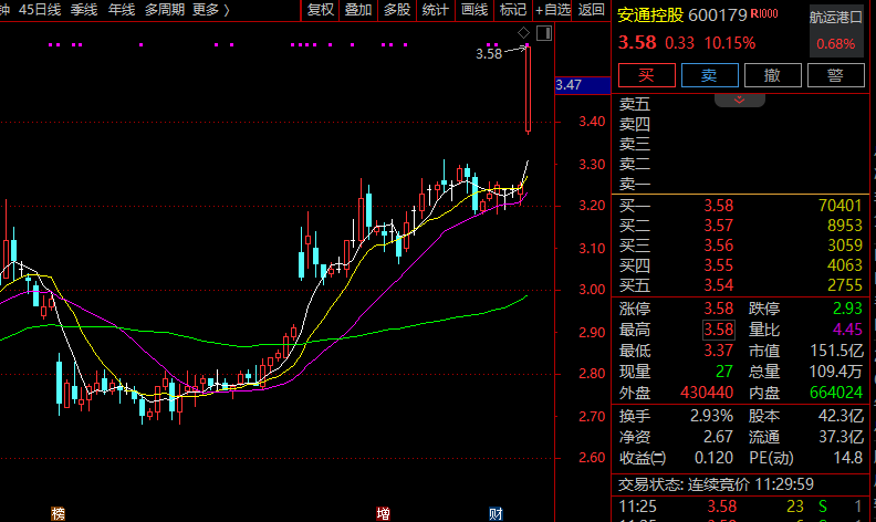 8月25日,安通控股股价高开后快速拉升,并很快涨停。截至11点30分,公司股价报收于3.58元/股,系2年半以来的阶段性高点。半个交易日的成交额达到了3.88亿元。