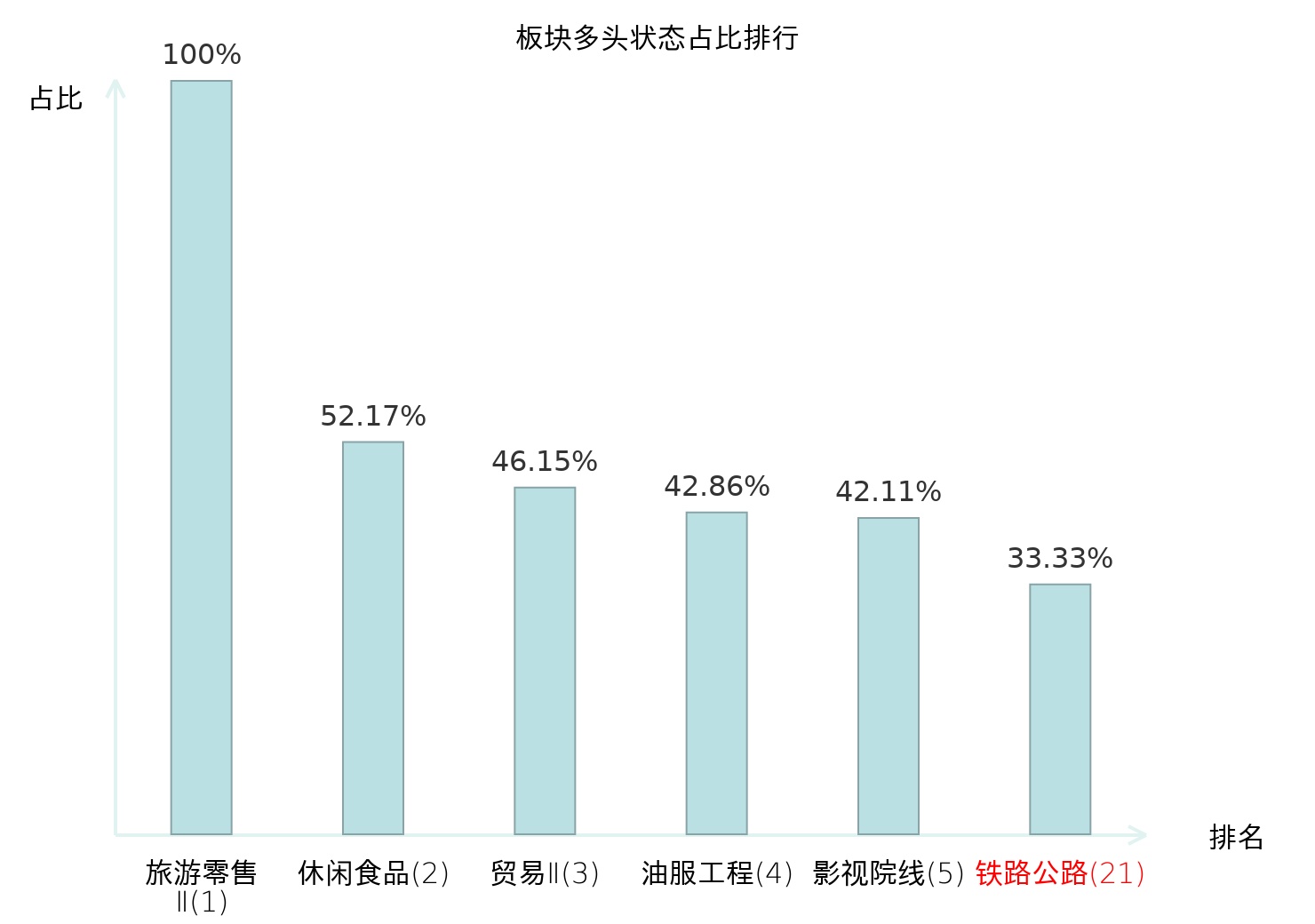 全市场所有行业板块中主力多头状态占比排名中,旅游零售Ⅱ板块位居第一。体育Ⅱ板块名次提升最快,较昨日上升99位。