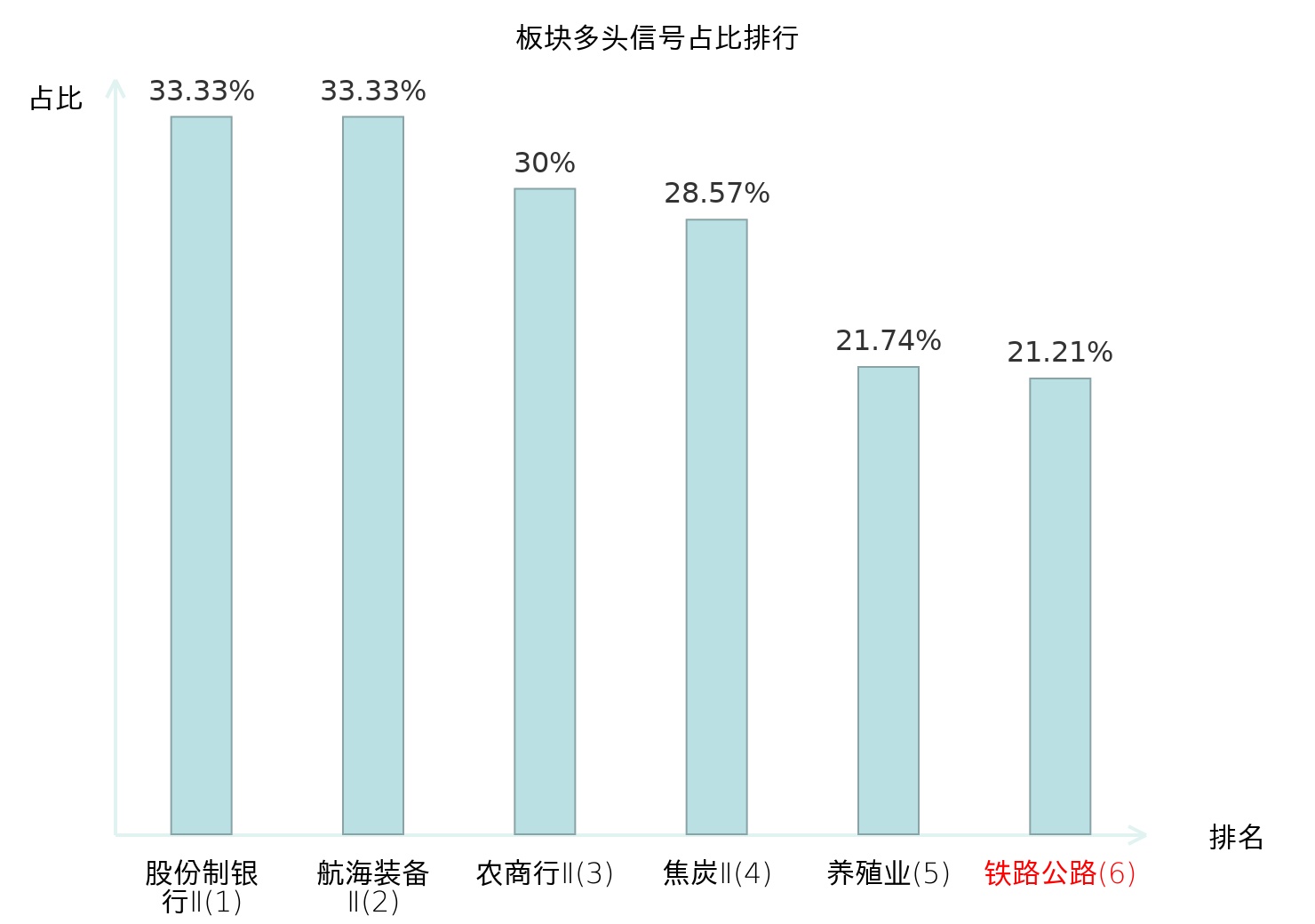 全市场所有行业板块中主力多头信号占比排名中,股份制银行Ⅱ板块位居第一。焦炭Ⅱ板块名次提升最快,较昨日上升119位。