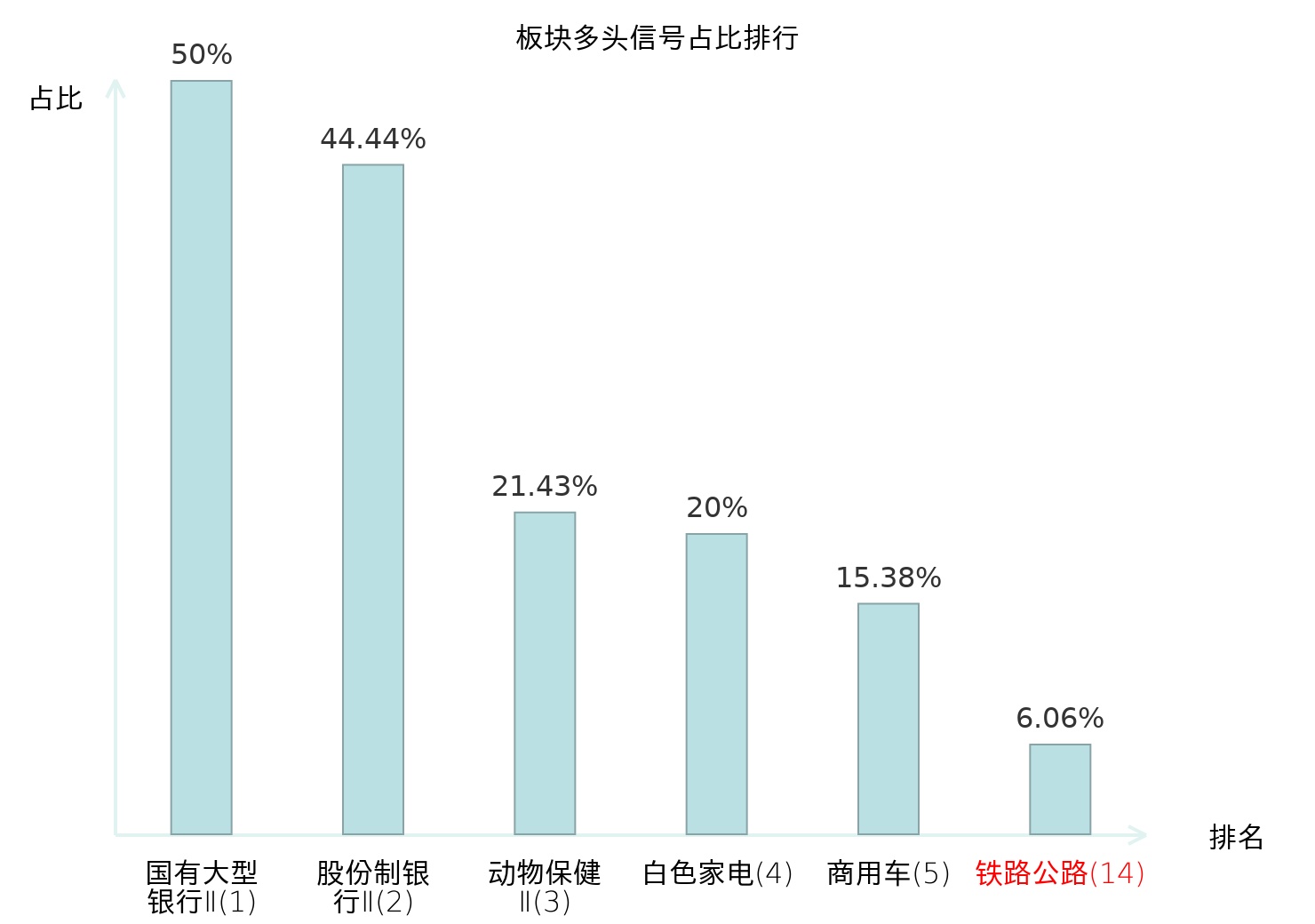 全市场所有行业板块中主力多头信号占比排名中,国有大型银行Ⅱ板块位居第一。房屋建设Ⅱ板块名次提升最快,较昨日上升114位。
