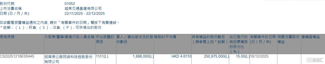 格隆汇12月22日丨根据联交所最新权益披露资料显示,2025年12月18日,越秀交通基建(01052.HK)获招商局公路网络科技控股股份有限公司在场内以每股均价4.611港元增持188.6万股,涉资约869.63万港元。