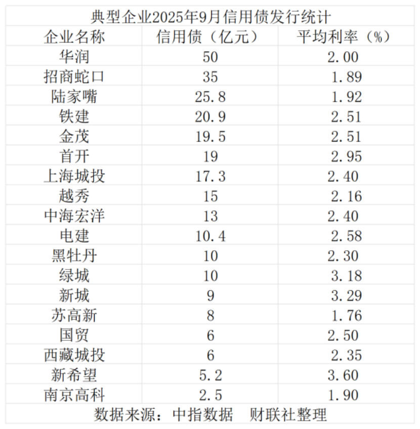 从发行主体看,房地产行业融资呈现“央国企主导、民企局部改善”的二元格局。一方面,华润、招商蛇口陆家嘴中国铁建等代表性央国企发行总额均超过20亿元,印证了其在债券市场的绝对主导地位;另一方面,绿城、新城、新希望地产等民企也成功发行信用债,合计融资约36.2亿元,融资渠道局部改善。部分典型企业具体数据见下表:
