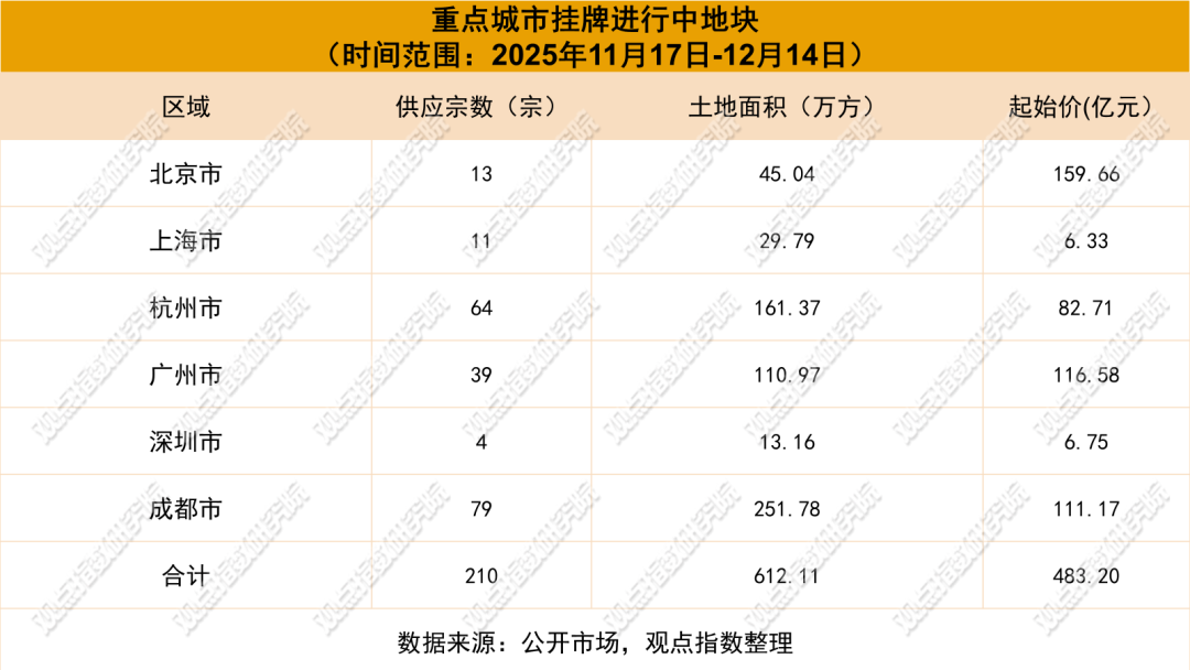 据观点指数不完全统计,2025年11月17日-2025年12月14日期间,6个重点城市一共有210宗地块处于挂牌进行中,起始价483.20亿元,环比回升32.01%,面积612.11万平方米。