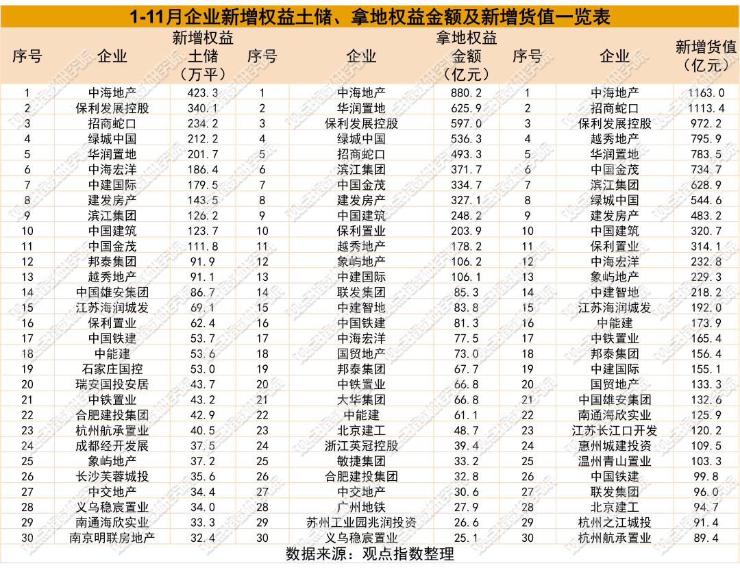 从权益拿地金额来看,1-11月土地投资力度最大的企业为中海地产、华润置地、保利发展控股、绿城中国、招商蛇口,权益扩储金额分别为880.2亿元、625.9亿元、597亿元、536.3亿元、493.3亿元。