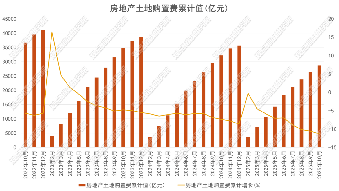 10月土地购置费累计值为28653.01亿元,环比上升8.64%,同比下降11.3%,跌幅相较上月扩大0.7个百分点,但增速持续放缓,土地购置费的累计规模仍显著低于去年同期。