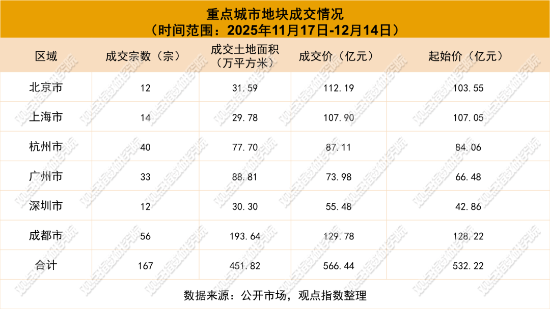 成交方面,据观点指数不完全统计,2025年11月17日-2025年12月14日期间,6个重点城市一共有167宗地成交,成交价566.44亿元,环比上升27%,成交土地面积451.82万平方米,环比回升17%。