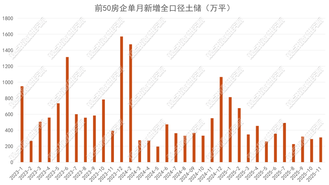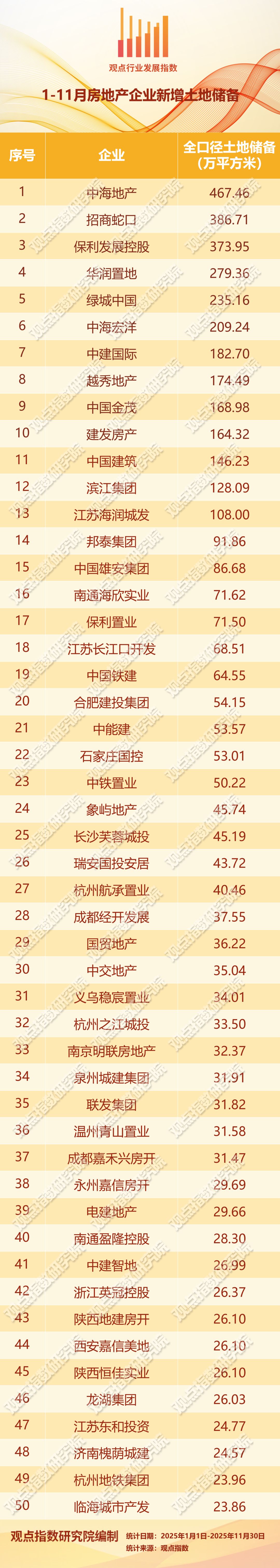 智通财经APP获悉,近日,观点指数发布《2025年12月房地产企业新增土地储备报告》。报告期内(11.24-12.18)前50房企单月新增土地建筑面积309.49平方米,环比回升6.8%。值得注意的是,前50房企1-11月累计新增土地建筑面积4543.42万平方米,同比微降1.8%。其中,中海地产、招商蛇口、保利发展控股新增的全口径土地储备分别为467.46万平方米、386.71万平方米、373.95万平方米,处于领先位置。该机构认为,相较于盲目扩张,企业更倾向于聚焦那些经过长期市场验证、具备扎实数据支撑的成熟区域。