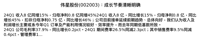 值得注意的是:2024年05月天风证券的孙海洋分析师,首次发布关于伟星股份的研究报告,标题为:伟星股份(002003):成长节奏清晰明确。