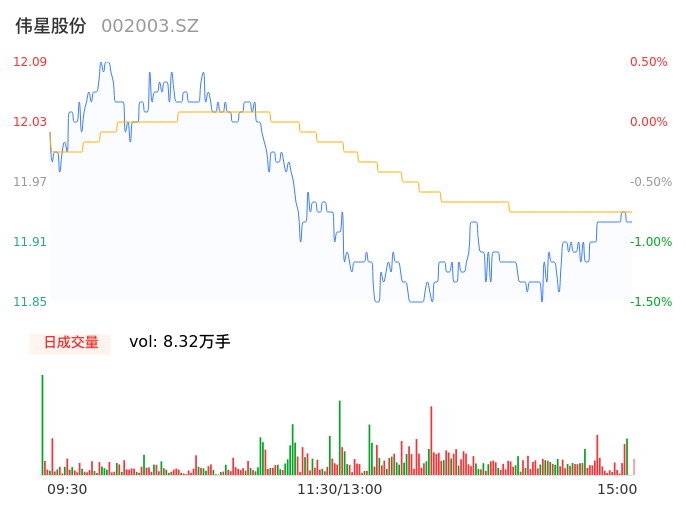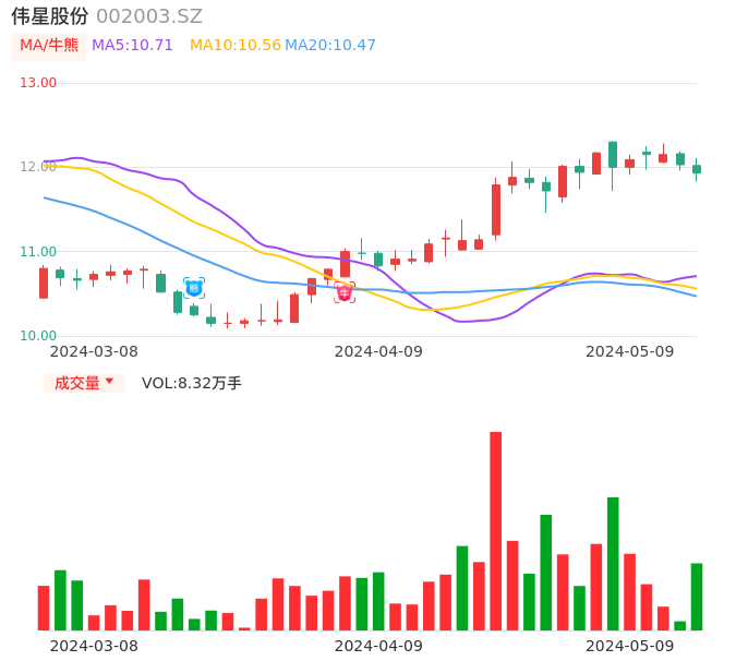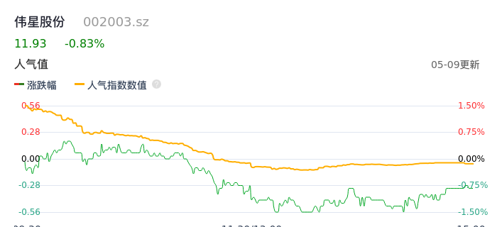 05月09日,伟星股份收报11.93,股价涨幅-0.83%,成交金额9935.46万元,换手率0.83%。