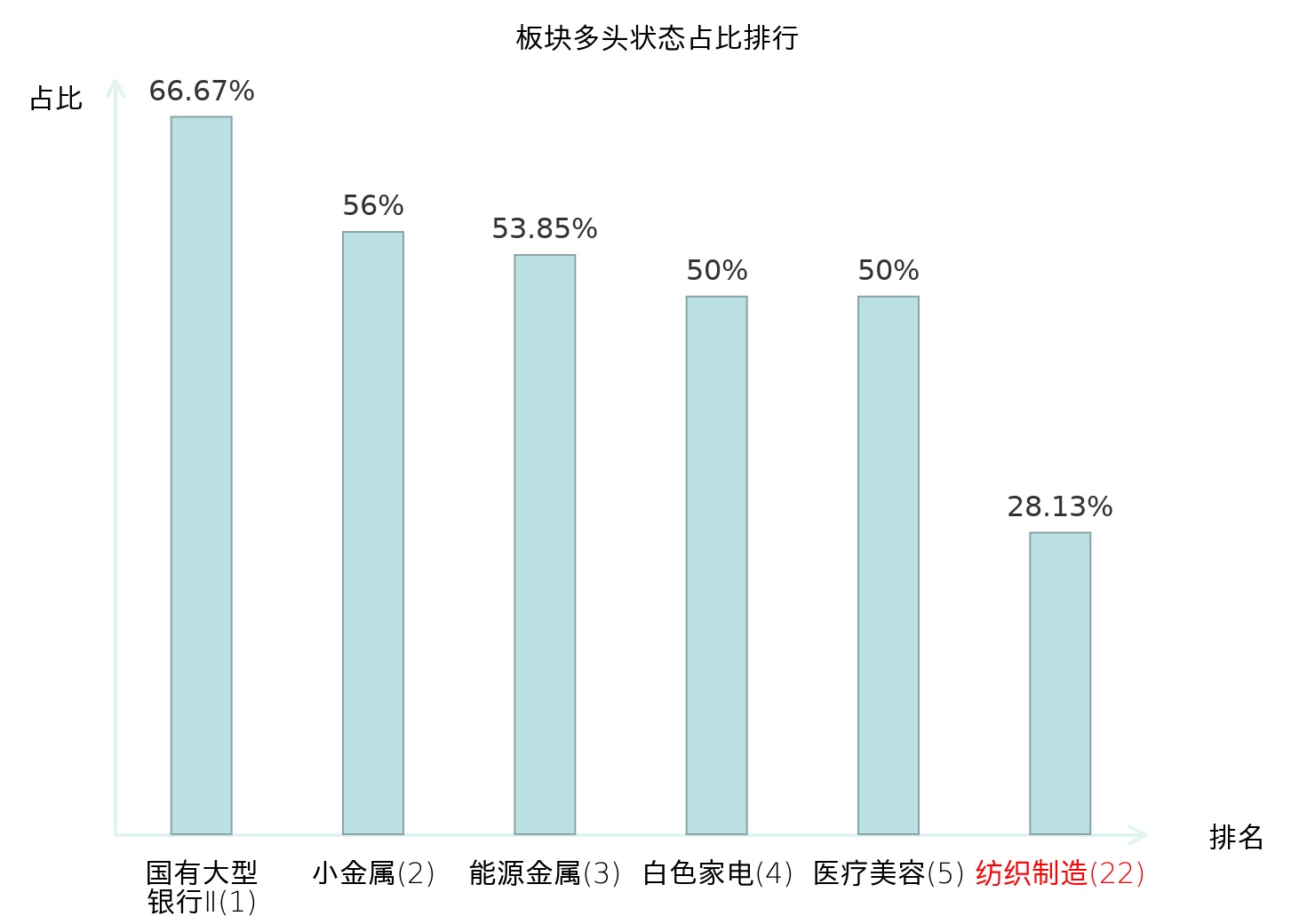 全市场所有行业板块中主力多头状态占比排名中,国有大型银行Ⅱ板块位居第一。酒店餐饮板块名次提升最快,较昨日上升59位。