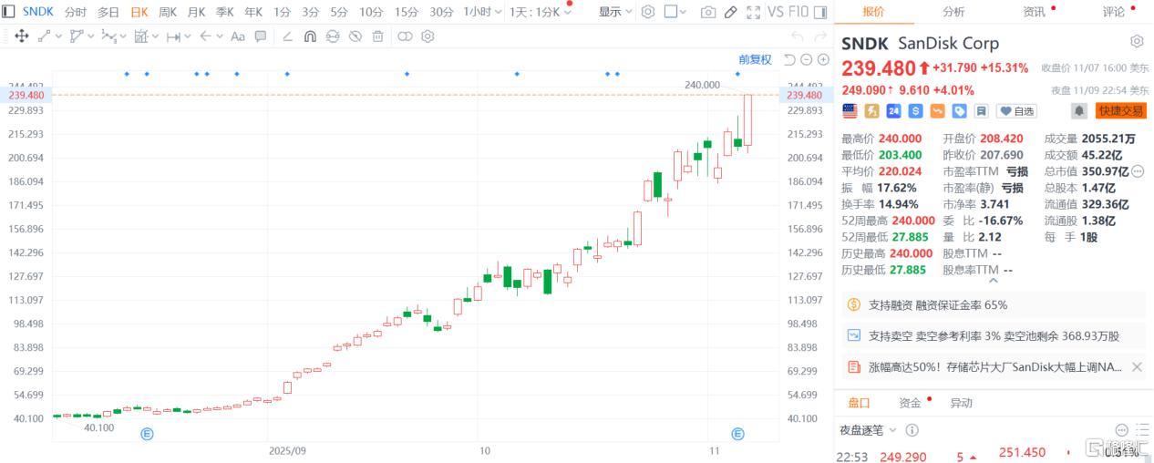 二级市场上,近四个月闪迪股价累计涨幅达450%。当地时间11月7日,闪迪大涨15.31%,报289.48美元/股,市值约为351亿美元。