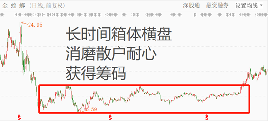 金螳螂股价在2015年9月到2017年10月份拉升前横盘震荡了二年的时间,从而达到消磨散户耐心,获得廉价筹码达到吸筹建仓的目的。