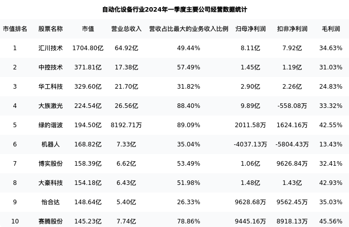 大族激光最新报告期数据为一季度,下表汇总了自动化设备行业内市值靠前的公司一季度主要经营数据