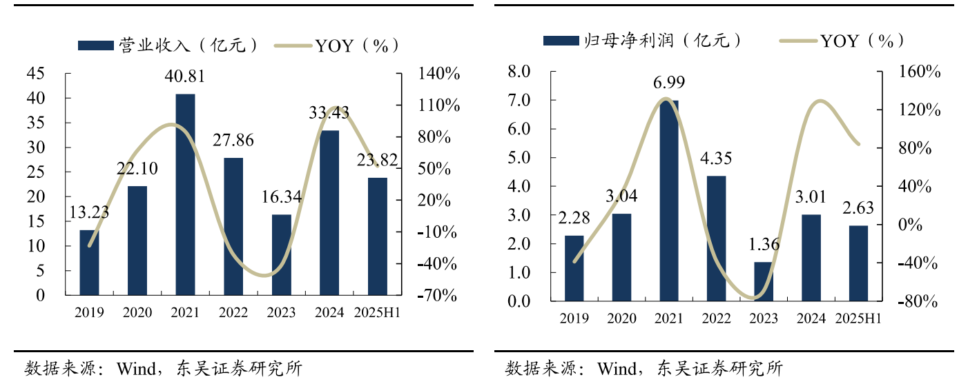 图表2:2019-2025H1公司营业收入(亿元)(左) 2019-2025H1公司归母净利润(亿元)(右)