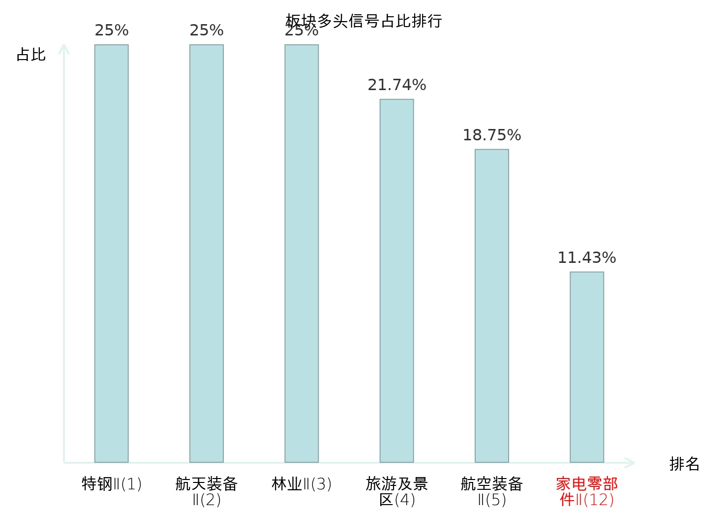 全市场所有行业板块中主力多头信号占比排名中,特钢Ⅱ板块位居第一。林业Ⅱ板块名次提升最快,较昨日上升122位。