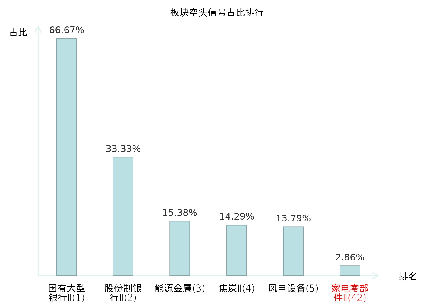 全市场所有行业板块中主力空头信号占比排名中,国有大型银行Ⅱ板块位居第一。风电设备板块名次提升最快,较昨日上升126位。
