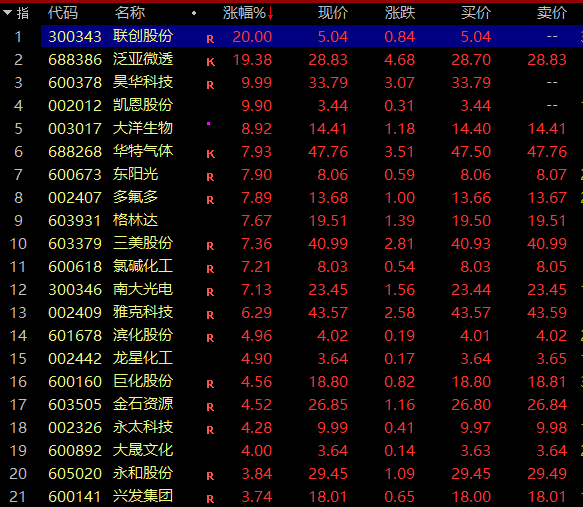氟概念早间也放量高开高走,板块指数盘中大涨逾6%,创1年多来最大涨幅。联创股份开盘不到5分钟就直线20%涨停;泛亚微透亦大涨超19%,逼近涨停;昊华科技则连续第3日涨停,凯恩股份等也强势封板。