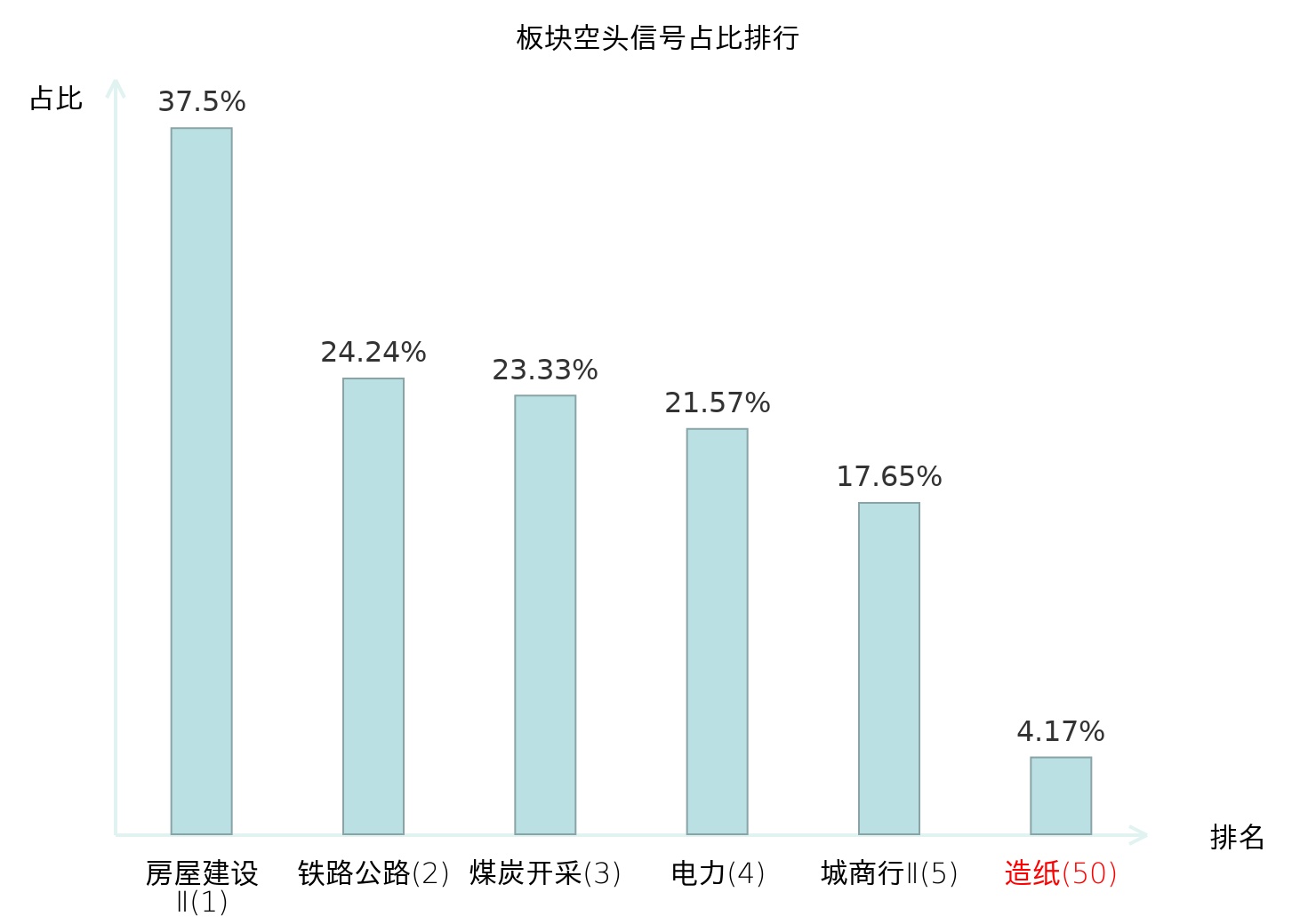 全市场所有行业板块中主力空头信号占比排名中,房屋建设Ⅱ板块位居第一。煤炭开采板块名次提升最快,较昨日上升117位。