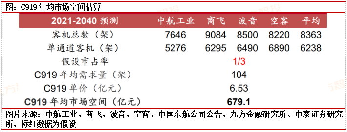 C919预计未来20年年均拉动超600亿元市场。随着我国大飞机产业国产化替代的不断推进,其投资价值也逐步显现。在市场空间方面,到2040年我国预计平均每年将新增客机418架,其中单通道客机312架,假设未来C919国内市场占有率达1/3,则未来20年C919每年销量约104架,按照每架6.53亿人民币计算,C919平均年销售额约679.1亿元。
