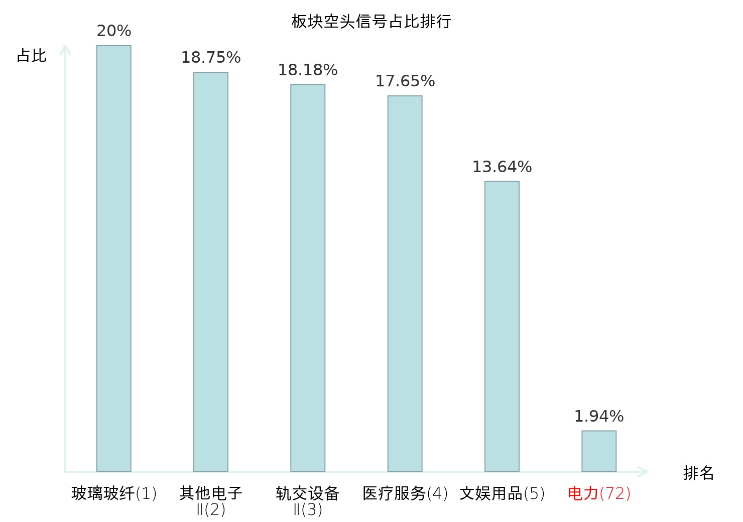 全市场所有行业板块中主力空头信号占比排名中,玻璃玻纤板块位居第一。医疗服务板块名次提升最快,较昨日上升126位。