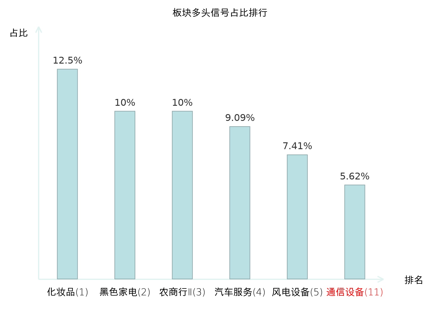 全市场所有行业板块中主力多头信号占比排名中,化妆品板块位居第一。黑色家电板块名次提升最快,较昨日上升111位。