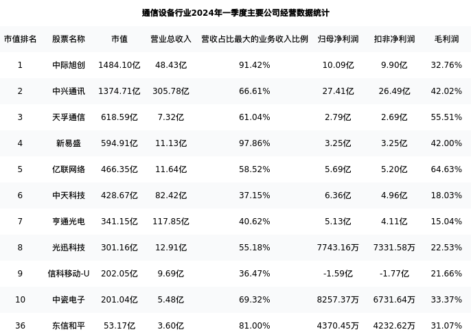 东信和平最新报告期数据为一季度,下表汇总了通信设备行业内市值靠前的公司一季度主要经营数据