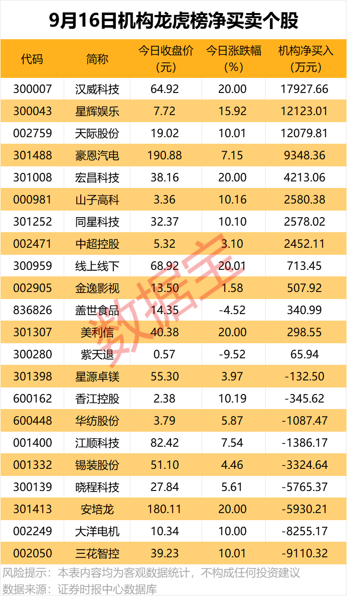 今日龙虎榜中,净买入的个股13只,净卖出的个股9只。汉威科技、星辉娱乐、天际股份净买入金额均超1亿元。
