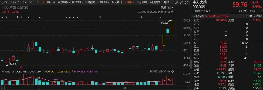 航天军工板块异动拉升,中天火箭涨停,走出三天两板。