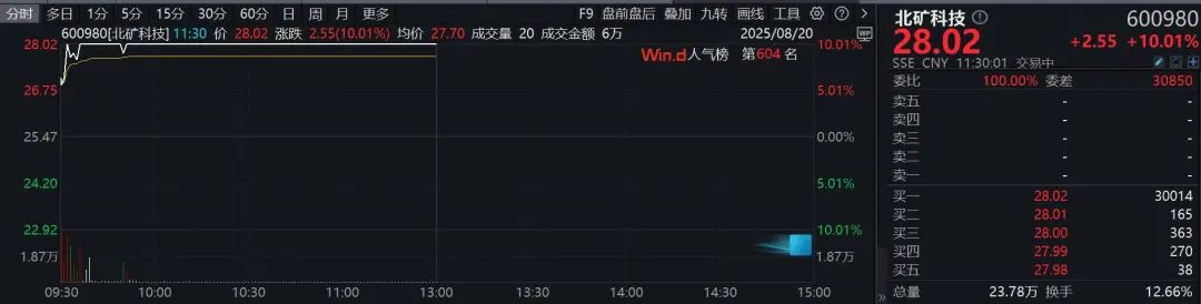 稀有金属概念股早间集体逆市上扬,黄金板块指数创历史新高,稀土永磁板块指数创近15年来新高,并逼近历史最高点,钛金属板块指数创2年半来新高,钴金属板块指数创近3年新高。北矿科技高开后仅约2分钟就垂直涨停,连续第2日封板,云南锗业东方锆业宜安科技等亦强势涨停或涨超10%。