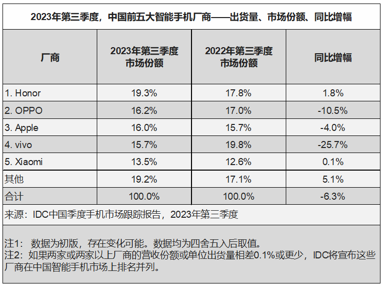荣耀如今在市场上究竟是什么地位?这是资本市场衡量它的重点。据国际数据公司(IDC)手机季度跟踪报告显示,2023年第三季度,中国智能手机市场出货量约6705万台,同比下降6.3%。