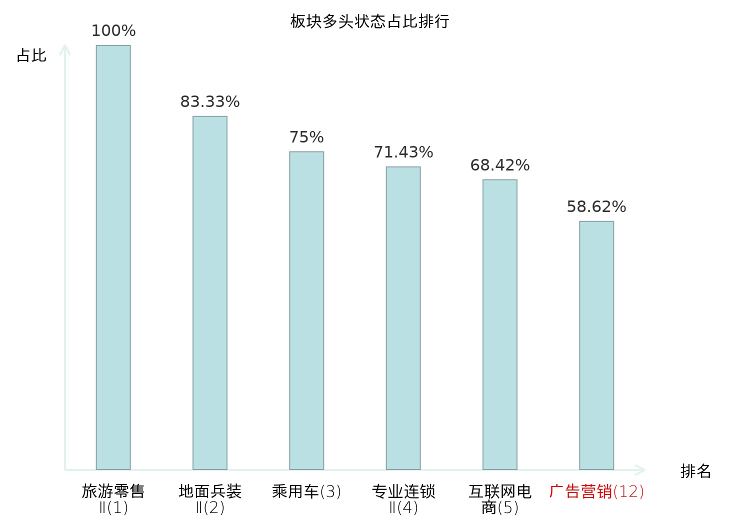 全市场所有行业板块中主力多头状态占比排名中,旅游零售Ⅱ板块位居第一。其他家电Ⅱ板块名次提升最快,较昨日上升55位。
