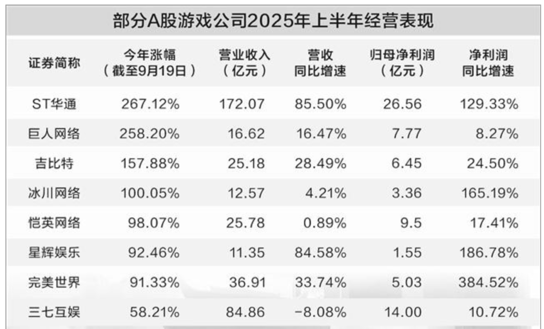 “没想到游戏市场今年表现这么好。”在接受证券时报记者采访时,有游戏企业高管直言,今年游戏行业不管是产品表现,还是股价走势,都有些出乎意料。从去年下半年开始,A股游戏板块热度就不断上升。至今,不论是板块整体还是个股,都已经积累了可观的涨幅。版号的持续发放,新游戏的亮眼表现,海外市场的有效拓展,都为游戏产业注入了信心。公开数据显示,2017年到2024年,我国游戏市场实际销售收入从2036亿元大幅增长至3258亿元,但其间游戏板块长期低位徘徊。这种局面在去年下半年迎来“反转”,尤其是今年4月以来,A股游戏板块表现强势。9月17日,申万游戏行业指数收盘突破4000点,创2017年以来新高。Wind数据显示,截至9月19日,申万游戏行业指数今年涨幅接近80%,在申万二级行业指数中名列第三。部分个股表现十分抢眼。年初至今,ST华通、巨人网络、吉比特、冰川网络等游戏公司涨幅超过100%,其中,ST华通和巨人网络涨幅超过200%。9月初,ST华通市值超越分众传媒,成为A股传媒板块市值最高的企业,目前其最新市值超过1400亿元。板块走出低谷,让部分游戏企业高管颇为感慨。过去几年,恺英网络股价最低时一度逼近2元,市值仅剩数十亿元;ST华通近期股价一度突破20元,而去年7月一度跌破3元;巨人网络等公司股价也在低位徘徊近4年。今年游戏板块为何迎来反转?从政策层面看,游戏版号的持续发放,无疑是助力产业发展的“强心针”。据证券时报记者统计,截至8月份,今年发放的游戏版号已达1119个,同比增长明显。8月份166款国产游戏获得版号,创近几年来单月国产游戏版号发放新高。政策背景之外,今年游戏公司的产品布局、市场开发、技术投入等不断迎来收获,共同成为驱动游戏产业稳健发展的“内生动力”。伽马数据联合创始人、首席分析师王旭向证券时报记者表示,游戏板块估值回升,是多种因素共同作用的结果,大致包括四点,即行业整体业绩回暖,AI技术降本增效,高流水产品的收入披露以及小游戏生态爆发。根据伽马数据发布的报告,今年上半年,国内游戏市场实际销售收入1680亿元,同比增长14.08%,国内游戏用户规模达到6.79亿,两项数据均创历史新高。这种态势也持续到了今年7月,游戏产业的各项纪录仍在被持续刷新。出海表现亦相当亮眼。上半年,我国自主研发游戏海外市场实际销售收入95亿美元(约合人民币680亿元),同比增长11%。在研究机构Sensor Tower发布的8月份中国手游出海收入榜中,排在前列的不再只有腾讯、网易、米哈游等“老面孔”的产品,更多新厂商的新产品崭露头角。在具体产品方面,王旭认为,今年上市游戏企业披露的部分10亿元以上高流水收入产品,增强了投资者的信心,特别是对验证手游出海商业模式和未来前景起到了作用;另外,外界对游戏公司通过小游戏等细分市场实现增长的预期,在部分财报中也得到验证,都推动了板块估值的回升。“今年游戏板块取得良好表现,主要原因还是游戏作品表现亮眼。”某券商互联网传媒行业首席分析师也向证券时报记者表示,前两年储备的部分重点游戏今年上线后出现爆发,同时国产游戏出海表现很好,共同推动了游戏板块此轮行情。以今年以来涨幅接近260%的巨人网络为例,催化股价的一大因素是其自研新游戏《超自然行动组》的亮眼表现。在2025年半年报中,巨人网络表示,该游戏上线以来用户和流水规模迅速增长。但因收入递延因素,其主要贡献将于后续报告期内逐步释放。涨幅接近270%的ST华通则因多款游戏在国内外市场爆火,收入连续大幅增长。2024年,ST华通营收同比增长70.3%,其中外销收入大幅增长85.9%至113.7亿元;今年上半年,ST华通营收同比继续大增85.5%。“国内游戏厂商在游戏精品化和游戏出海上正在全面进击,厂商普遍深耕研发,而不再像过去那样靠‘山寨游戏’、‘换皮游戏’来‘广种薄收’。而游戏出海带来的巨大增量和市场红利,让整个游戏产业的前景更加光明。”游戏产业分析师张书乐向证券时报记者表示。仔细梳理我国游戏产业的发展路径,不难发现,无论是精品化还是游戏出海,都不是行业里的“新鲜议程”,而是过去几年游戏厂商们一直在做的工作。正是这种漫长的布局和投入,才换来了游戏产业如今的“高光时刻”。多位受访者认为,前期的积累正是如今产业爆发的关键。前述游戏企业高管向证券时报记者表示,国内游戏厂商通过多年的运作,不管是IP、产品还是技术储备,都已经有了足够深厚的积累,新产品的开发上线路径更加成熟。在2025年半年报中,巨人网络就提到,《超自然行动组》的成功,根植于公司多年来在大DAU(日活跃用户数)产品方向的研发沉淀和经验积累。深厚积累带来的持续出新品能力,也让游戏板块被继续看好。前述券商互联网传媒首席分析师向证券时报记者表示,“国内游戏产业的景气度有望持续一段时间,主要是因为当前国内游戏公司已经具备持续的新品产出能力,而这正是游戏板块能够实现估值提升的关键。”据证券时报记者统计,2024年以来,A股主要游戏公司的新品尤其是重点新品迎来密集上线,而当前储备的重点产品数量也十分丰富。厂商们亦在主动走出“舒适区”,拓宽发展边界。依靠单一老产品“续命”,不再符合行业“主流叙事”。如今的游戏厂商们,一方面聚焦成熟产品的运营,坚守擅长的产品赛道;另一方面通过聚焦资源投向重点关键项