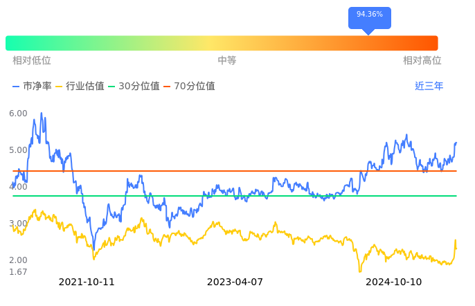 思源电气当前市净率PB为5.19,在所属的电网设备中,市净率PB排111,前五名分别为冠城大通市净率0.49、众业达市净率0.90、宏力达市净率1.01、新联电子市净率1.03、尚纬股份市净率1.06。思源电气当前市净率PB为5.19,超过近3年94.36%的历史数据。