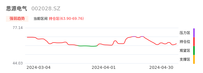 我们来看一下该股的九方特色指标强弱趋势的情况:思源电气自04月18日从压力区回到持仓区。股价在持仓区盘整一段时间后,目前有启稳迹象。后续重点关注上方压力位:69.76元是否能重新上攻。