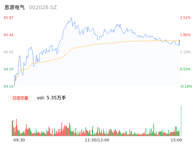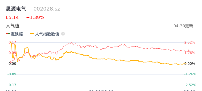 04月30日,思源电气收报65.14,股价涨幅1.39%,成交金额3.49亿元,换手率0.89%。