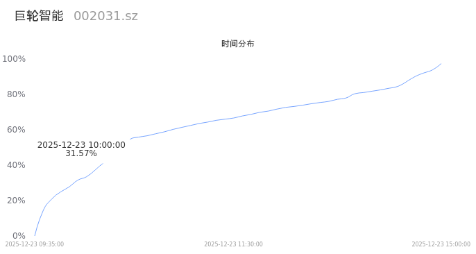 002031巨轮智能2025年12月23日成交89.07万手,成交金额6.60亿,相较昨日缩量43.65万手,换手率4.59%,成交清淡。