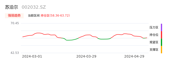 我们来看一下该股的九方特色指标强弱趋势的情况:苏泊尔近日从观望区上穿到持仓区。股价短期站稳多头区域,上升动能仍较为充足,可积极关注。后续重点关注上方压力位:63.72元是否能突破上攻。