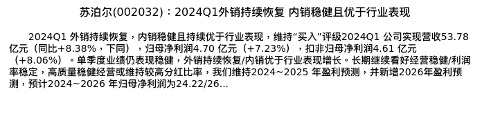 值得注意的是:2024年04月开源证券的吕明/周嘉乐分析师,首次发布关于苏泊尔的研究报告,标题为:苏泊尔(002032):2024Q1外销持续恢复 内销稳健且优于行业表现。