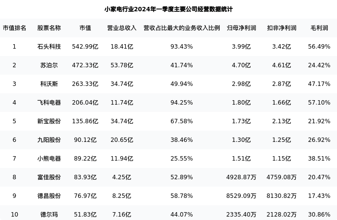苏泊尔最新报告期数据为一季度,下表汇总了小家电行业内市值靠前的公司一季度主要经营数据