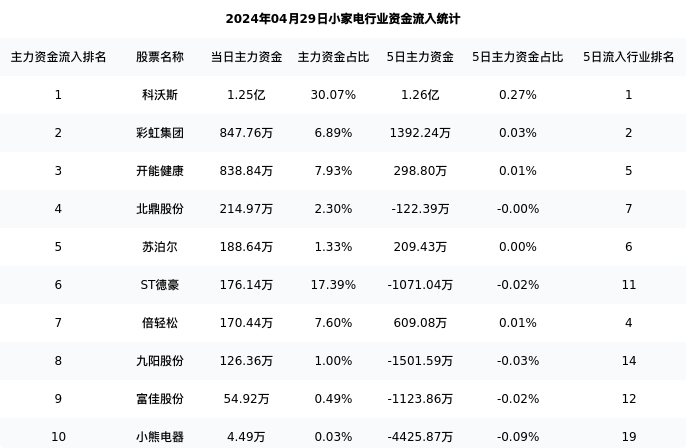 从主力资金流向来看,小家电行业今日主力资金流入11.72亿元,在所有申万二级行业中排名:39/131。