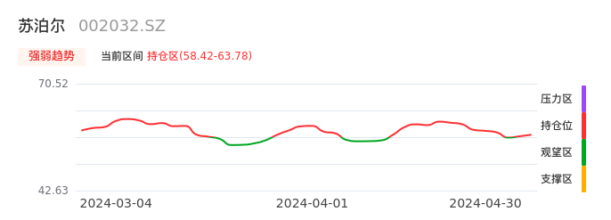 我们来看一下该股的九方特色指标强弱趋势的情况:苏泊尔近日从观望区上穿到持仓区。股价短期站稳多头区域,上升动能仍较为充足,可积极关注。后续重点关注上方压力位:63.78元是否能突破上攻。