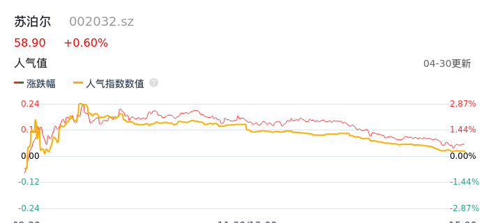 04月30日,苏泊尔收报58.90,股价涨幅0.60%,成交金额1.65亿元,换手率0.34%。
