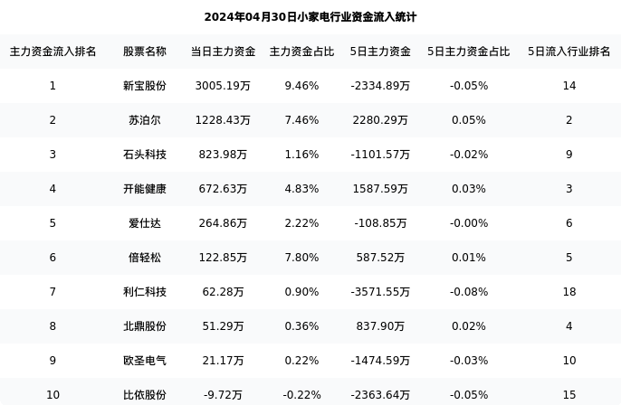 从主力资金流向来看,小家电行业今日主力资金流入9.43亿元,在所有申万二级行业中排名:27/131。