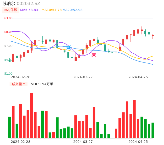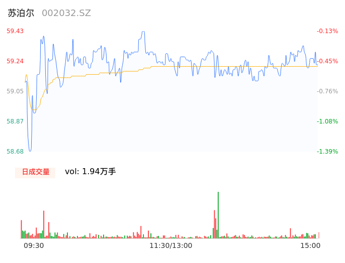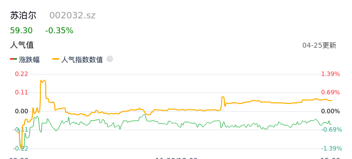 04月25日,苏泊尔收报59.30,股价涨幅-0.35%,成交金额1.15亿元,换手率0.24%。