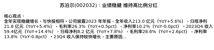 值得注意的是:2024年04月广发证券的曾婵/袁雨辰分析师,首次发布关于苏泊尔的研究报告,标题为:苏泊尔(002032):业绩稳健 维持高比例分红。