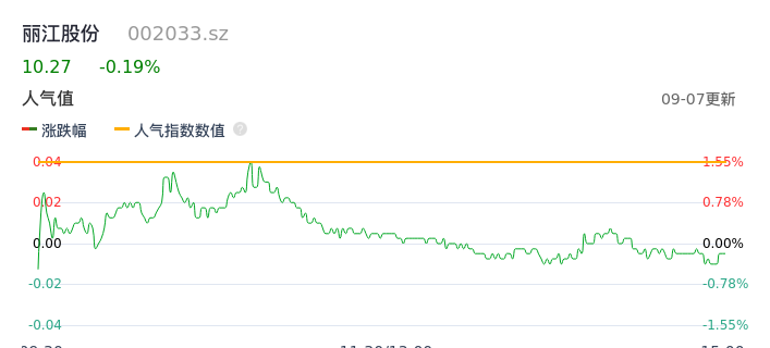 09月07日,丽江股份收报10.27,股价涨幅-0.19%,成交金额1.50亿元,换手率2.65%。