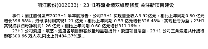 值得注意的是:2023年08月财通证券的刘洋/李跃博分析师,首次发布关于丽江股份的研究报告,标题为:丽江股份(002033):23H1客流业绩双维度修复 关注新项目建设。