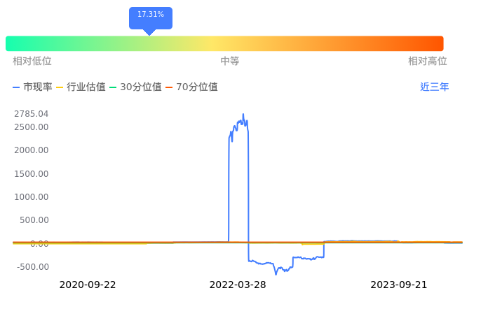 2023年09月21日,丽江股份下跌2.57%收于9.10,今日成交金额1.38亿元。下文将从市盈率PETTM、市净率PB、市现率3个角度去分析公司估值情况。