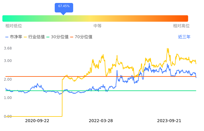 丽江股份当前市净率PB为2.21,在所属的旅游及景区中,市净率PB排5,前五名分别为中青旅市净率1.42、黄山旅游市净率2.06、峨眉山A市净率2.18、三特索道市净率2.18、丽江股份市净率2.21。丽江股份当前市净率PB为2.08,超过近3年67.45%的历史数据。