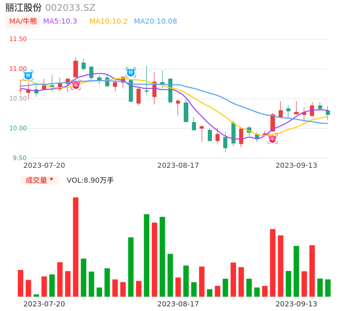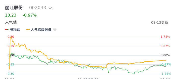09月13日,丽江股份收报10.23,股价涨幅-0.97%,成交金额9123.44万元,换手率1.62%。